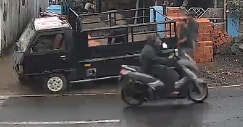 Terjadi peristiwa tabrak lari yang dilakukan oleh seorang pengemudi motor yang diduga motor NMAX, dengan pakaian pengendara menggunakan jas hujan.